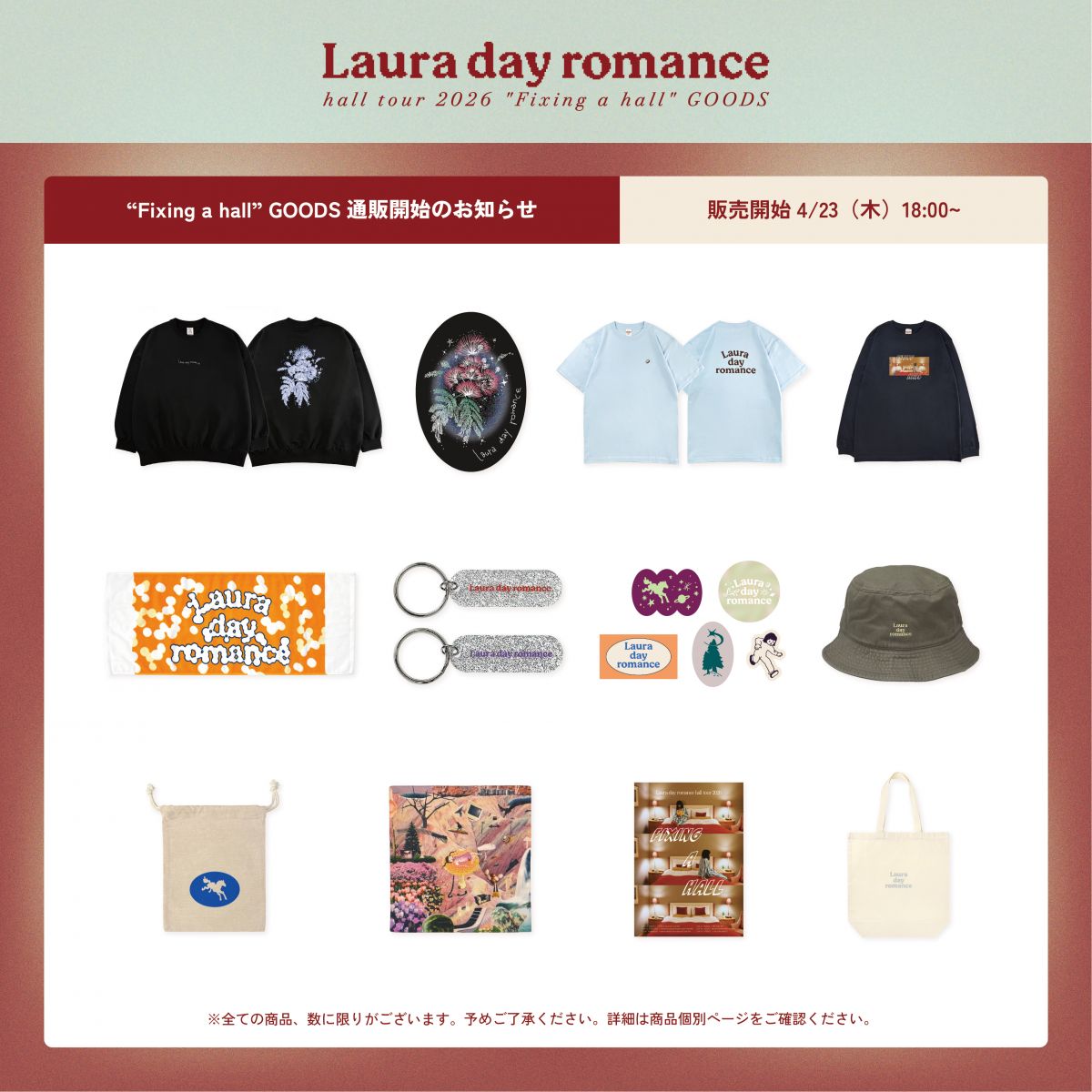 本日4/23(木)18:00〜『Laura day romance hall tour 2026 ”Fixing a hall”』にて販売したグッズの通販を開始いたします。